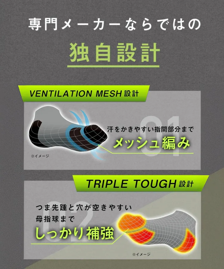 穴のあきやすいつま先かかと部分を補強し、汗をかきやすい指の付け根にベンチレーションメッシュ設計を採用。吸水速乾素材を使用しているのでさらっと快適に履いていただけます。