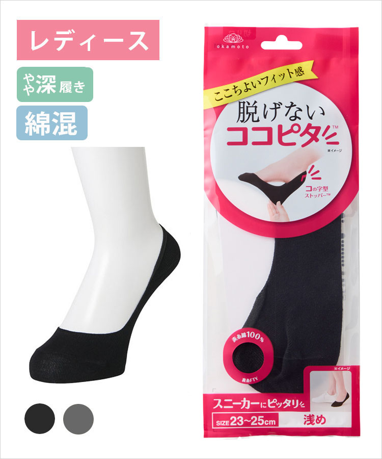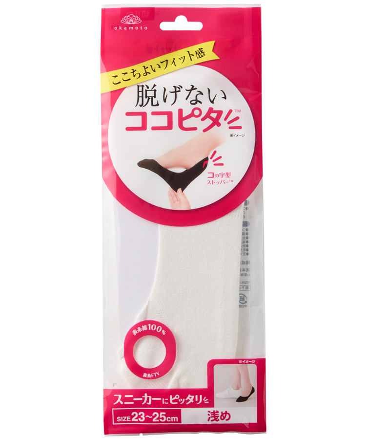 「脱げないココピタ」は、フットカバーの課題であった「“脱げ”による不快感」を、足の動きと生地の伸縮性を研究し、独自開発した「コの字型ストッパー※」で対策した靴下です。2018年3月より全国のスーパーマーケットおよび量販店にて発売しております。「コの字型ストッパー※」が、かかとをしっかりホールドし、「一日中脱げない」を実現しました。 ※特許第6449073号