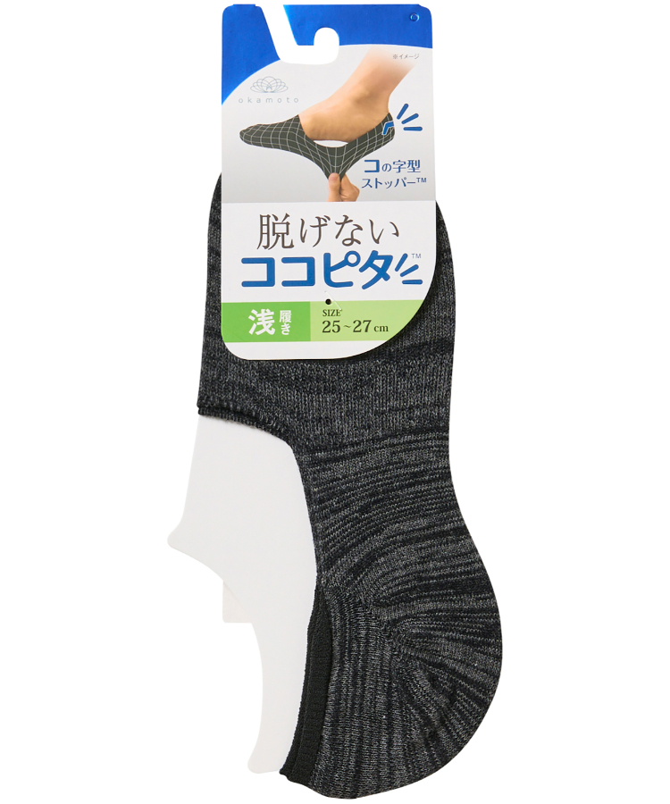 「脱げないココピタ」は、フットカバーの課題であった「“脱げ”による不快感」を、足の動きと生地の伸縮性を研究し、独自開発した「コの字型ストッパー※」で対策した靴下です。2018年3月より全国のスーパーマーケットおよび量販店にて発売しております。「コの字型ストッパー※」が、かかとをしっかりホールドし、「一日中脱げない」を実現しました。 ※特許第6449062号