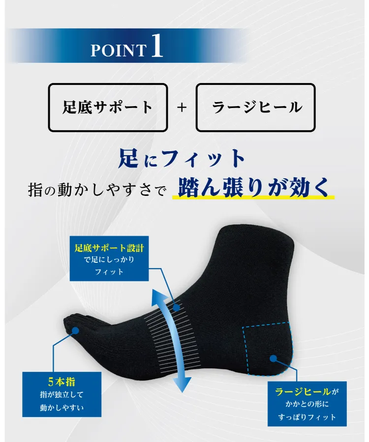 かかと部分を他製品より大きく編み上げるラージヒール設計で、足首前の生地が余りにくい。さらに足底サポート設計で、足の形にフィットし履き心地をアップ。