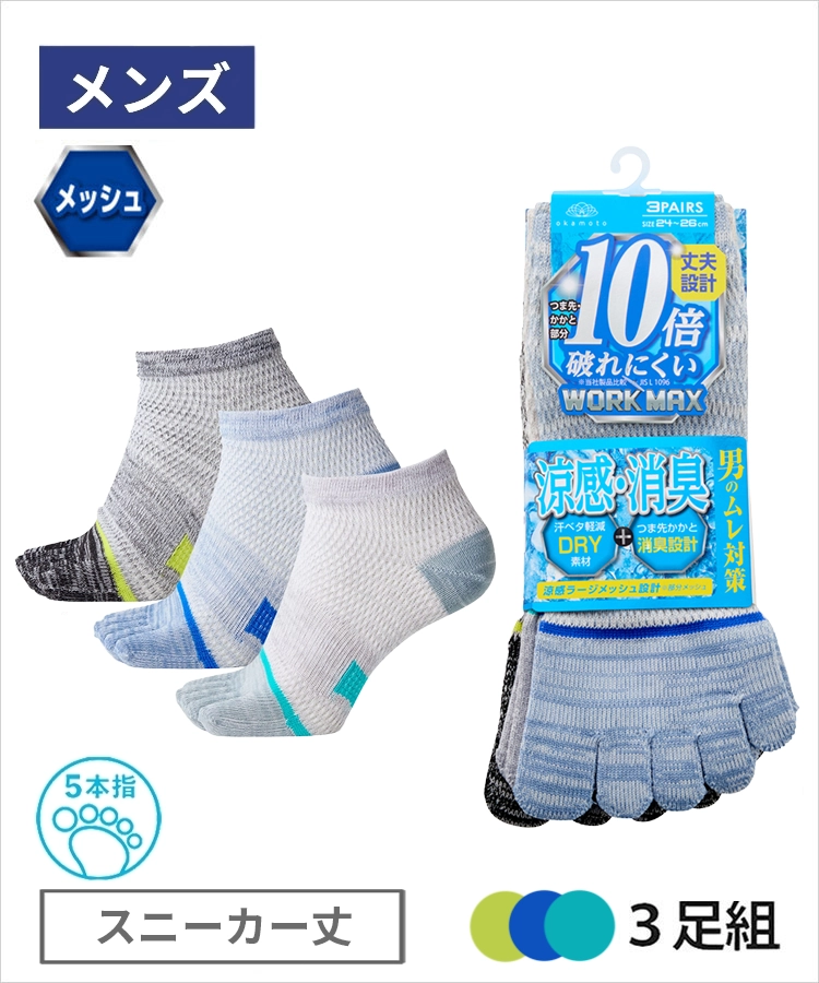 【3足組】WORK MAX 涼感メッシュ メンズ スニーカー丈 5本指 引揃 つま先ライン