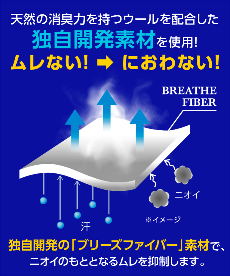 独自開発素材「ブリーズファイバー」を使用し、優れた消臭効果に加え、ニオイ発生の原因となるムレを抑え、サラサラな履き心地が続きます。
