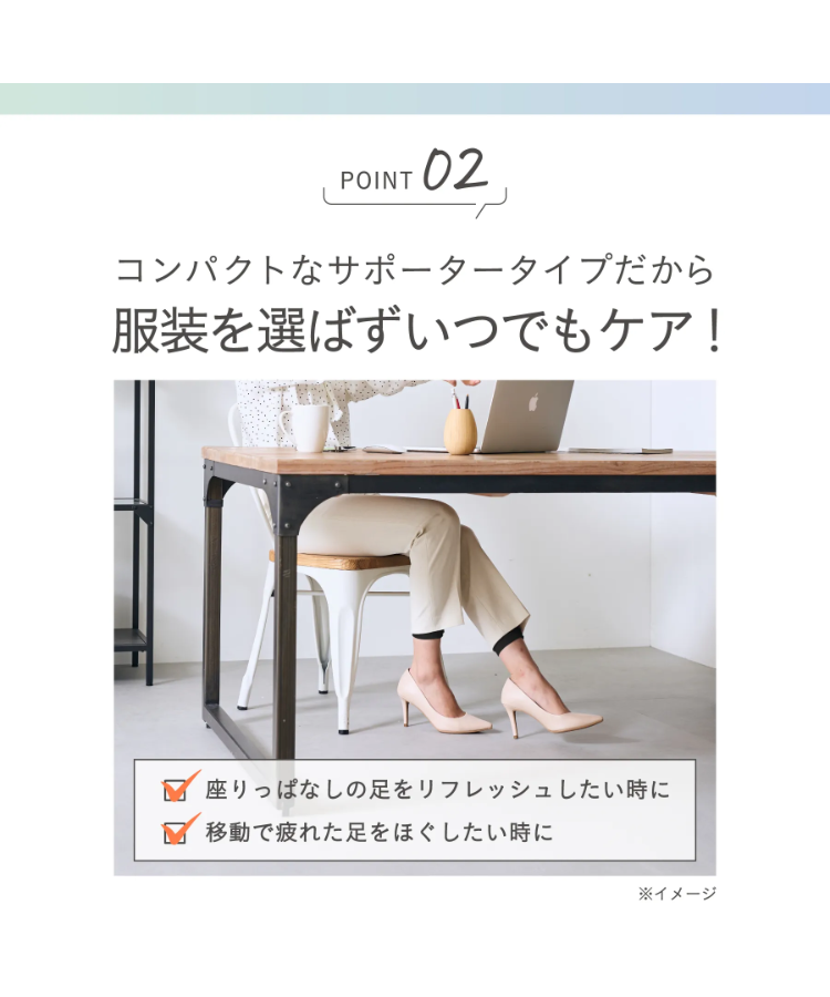 立ち仕事だけでなく、出張・旅行のときや、デスクワークでも。