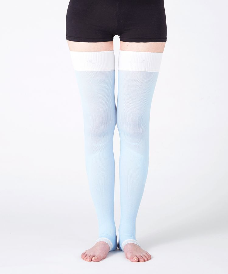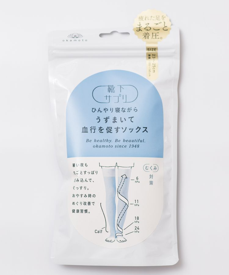 一日がんばった足に。履くだけで寝ながらむくみケアができるロングソックスです。うずまき状に圧をかけるのでラクに履け、しめつけないのに翌朝スッキリ。