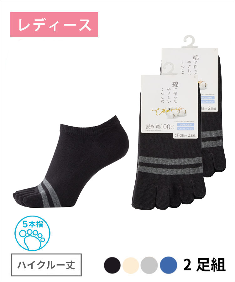 【2足組】綿で作ったやさしいくつした レディース ハイクルー丈 5本指 綿100% ライン