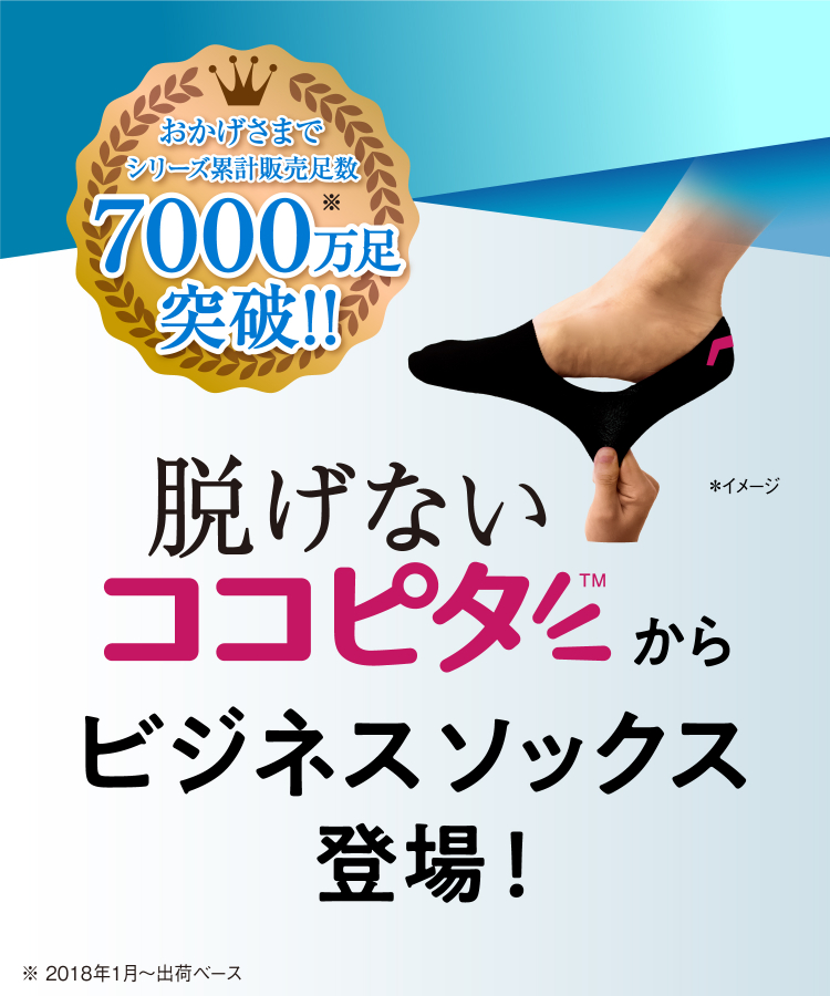 「脱げないココピタ」は、フットカバーの課題であった「“脱げ”による不快感」を、足の動きと生地の伸縮性を研究し、独自開発した「コの字型ストッパー※」で対策した靴下です。2018年3月より全国のスーパーマーケットおよび量販店にて発売しております。「コの字型ストッパー※」が、かかとをしっかりホールドし、「一日中脱げない」を実現しました。 ※特許第6449180号