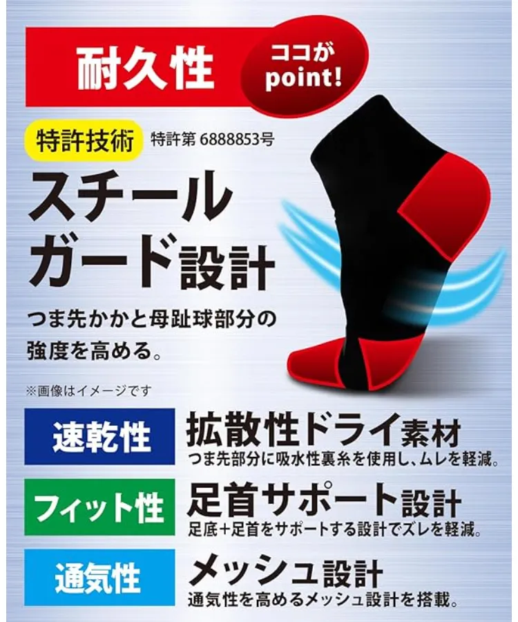 拡散性ドライ素材:つま先部分に吸水性裏糸を使用し、ムレを軽減。