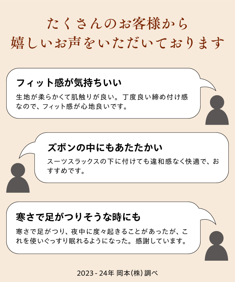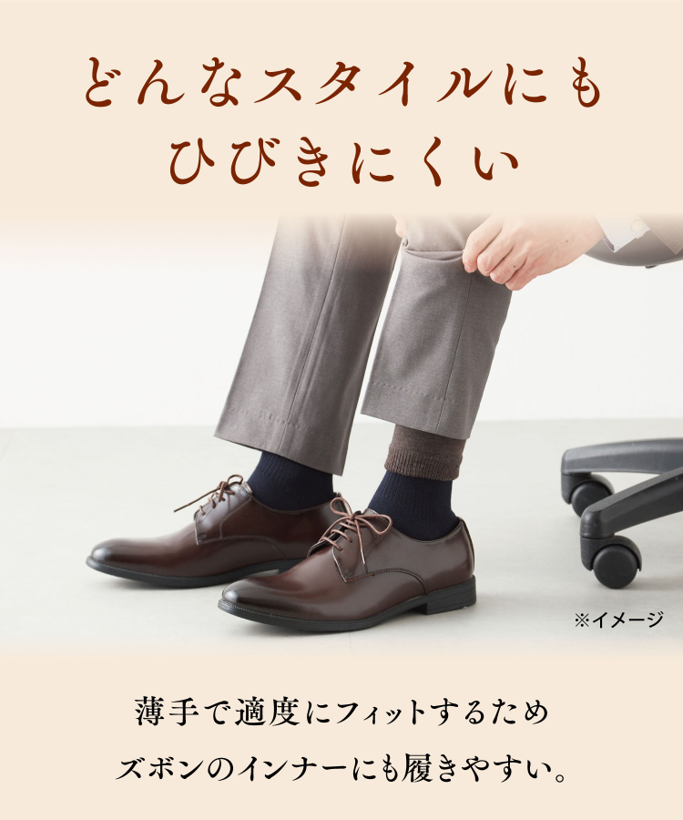 薄手のインナーレッグウォーマーなので、足元が寒い日中のお仕事やお出かけの際には、スーツやズボンの下に着用いただけます。