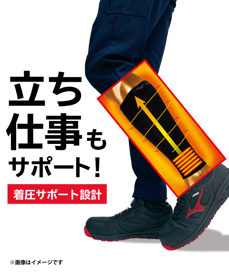足首から足全体を温める独自設計に、着圧機能をプラス。屋外作業での寒さ対策+立ち仕事をサポートします。