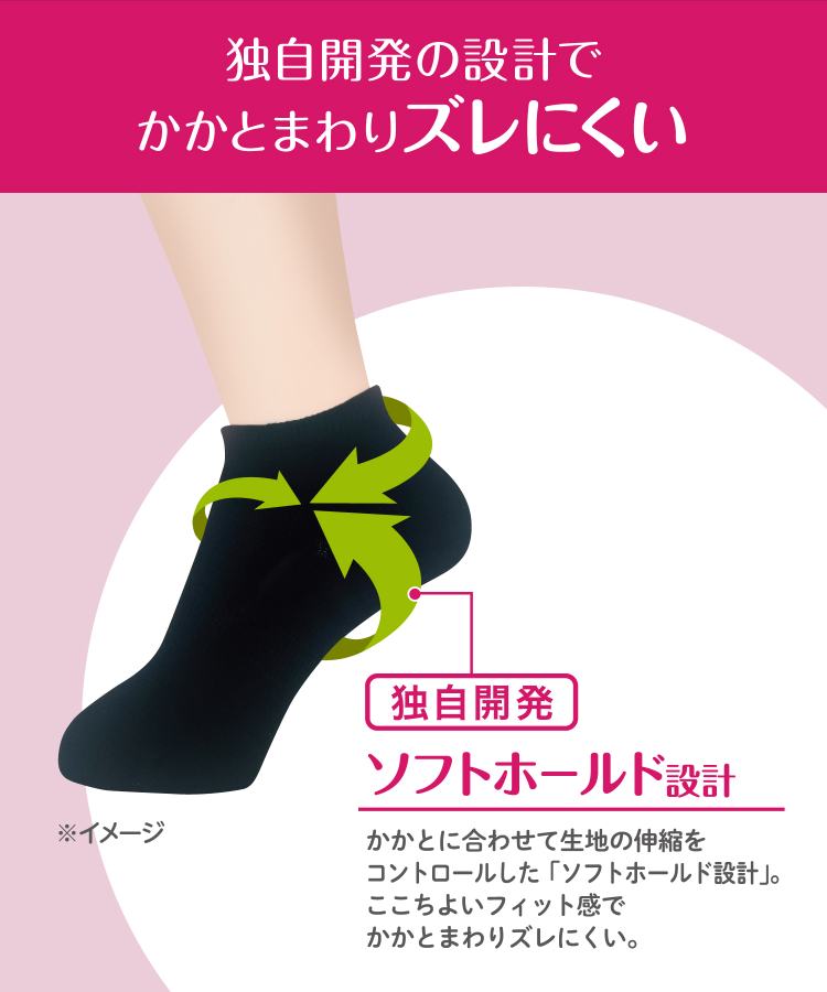足の動きと生地の伸縮を研究した独自開発・特許技術の「コの字型ストッパー™」がかかとをしっかりホールドし、「一日中、脱げない」を実現。