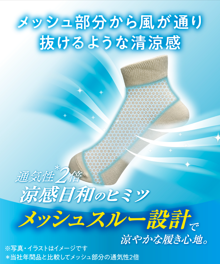 汗のかきやすい指の付け根と足の甲部分が通気性の優れた設計になっているので、風が通り抜けるような快適な履き心地です。