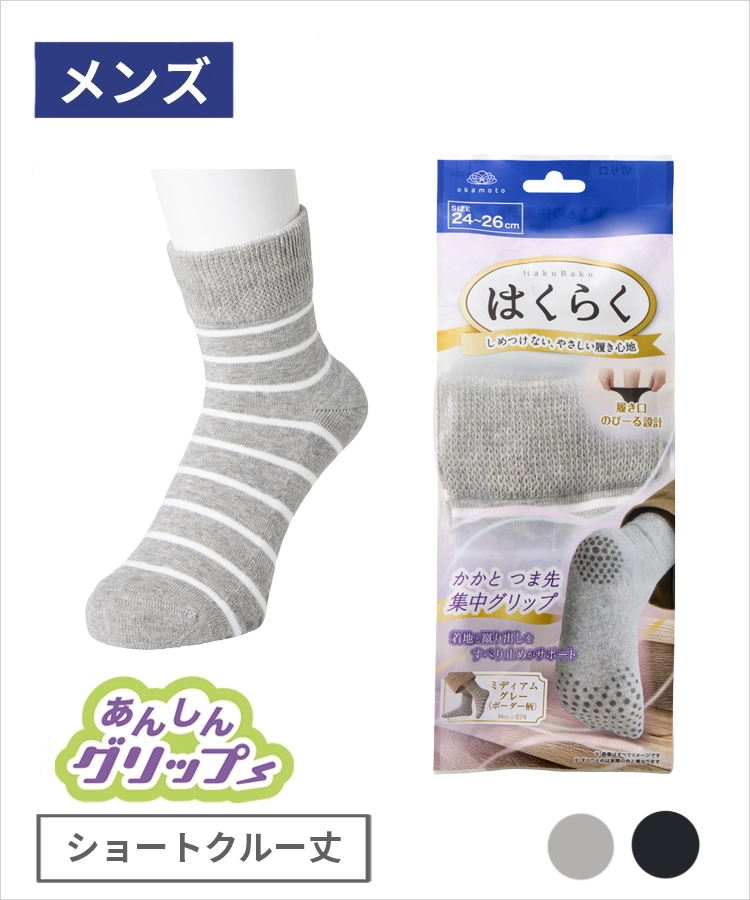 はくらく メンズ ショートクルー丈 のびーる あんしんグリップ 滑り止め付 パイル 平ボーダー お出かけ用