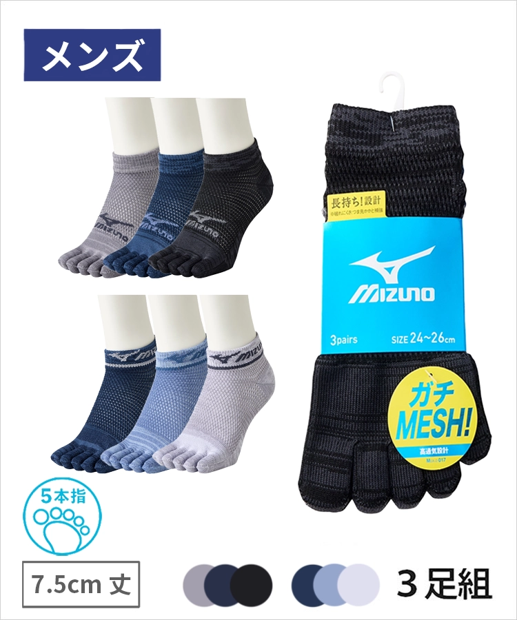 【3足組】MIZUNO デイリー ガチMESH メンズ 7.5cmスニーカー丈 5本指 オールメッシュ 引揃 ライン ミズノ