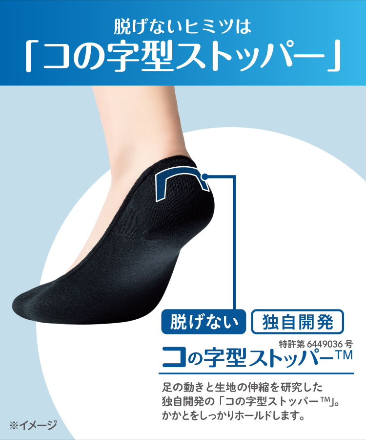足の動きと生地の伸縮を研究した独自開発・特許技術の「コの字型ストッパー™」がかかとをしっかりホールドし、「一日中、脱げない」を実現。