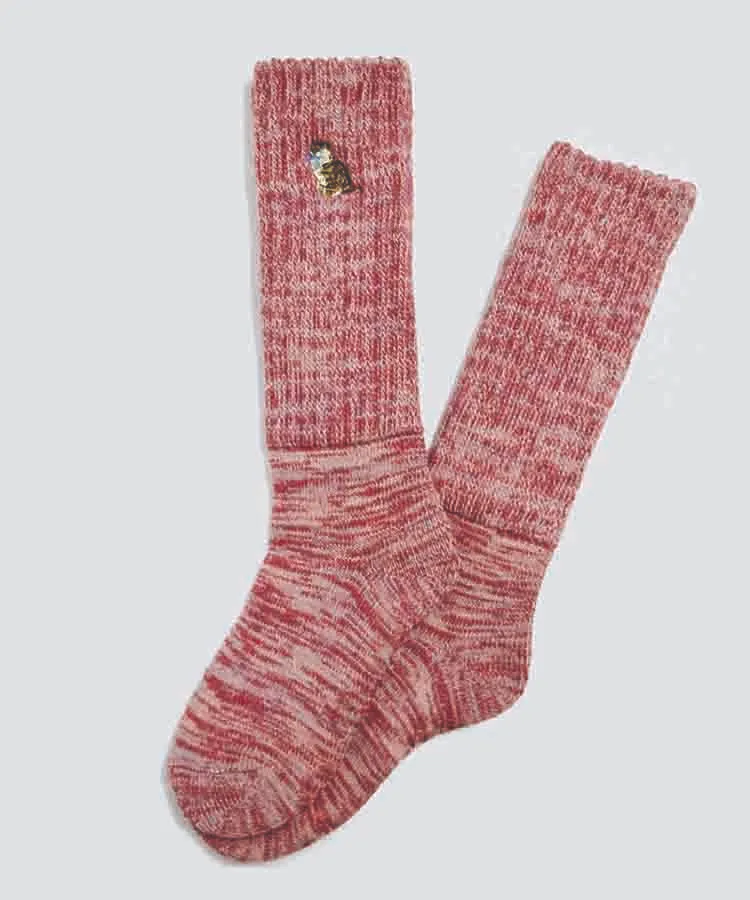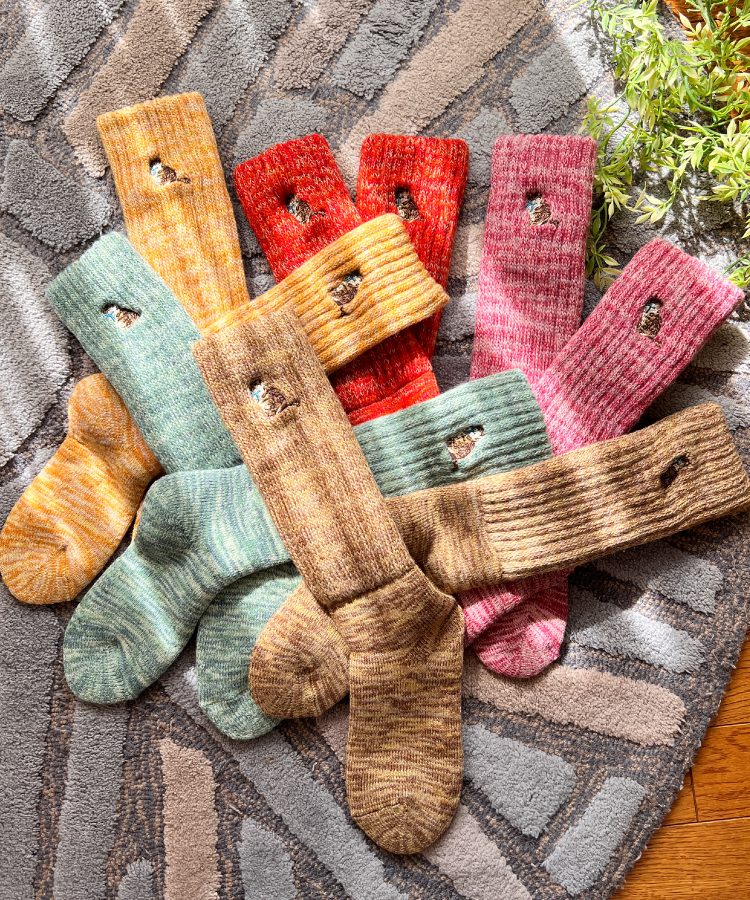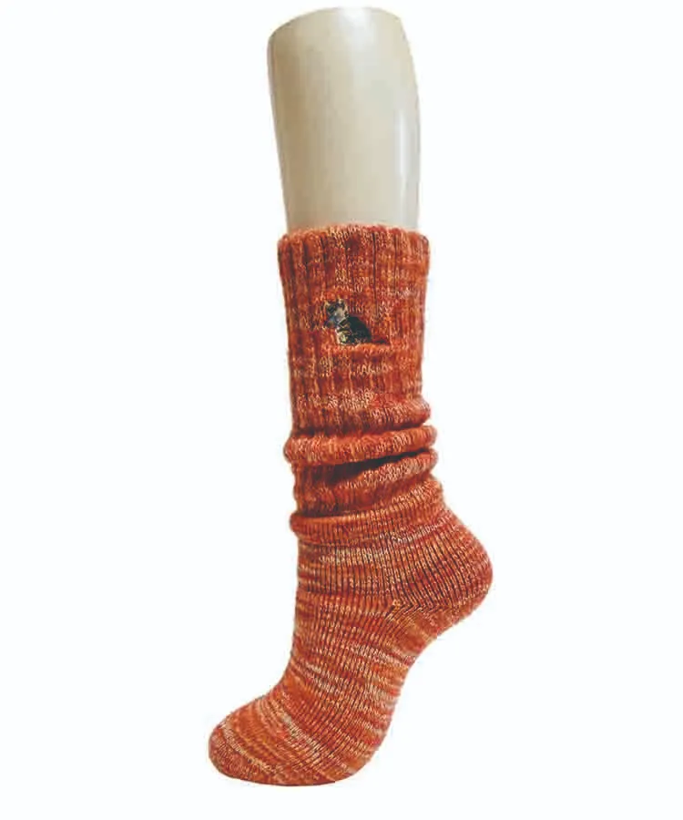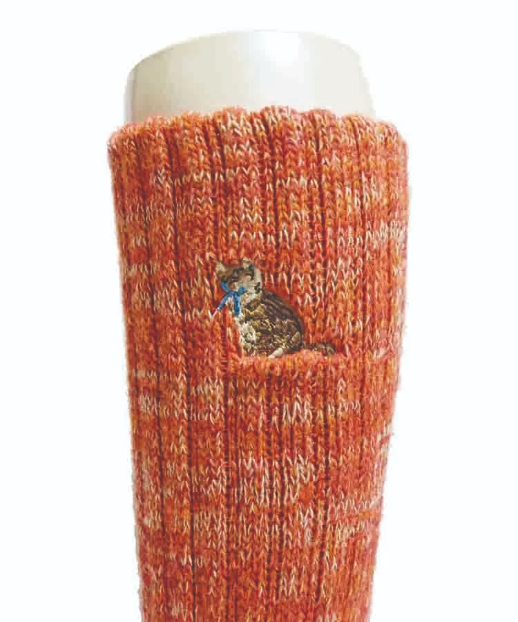 4色の糸が織りなすミックスカラーのルームソックスにネコの刺繍を施しました。