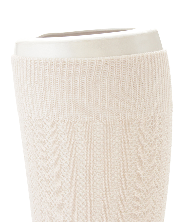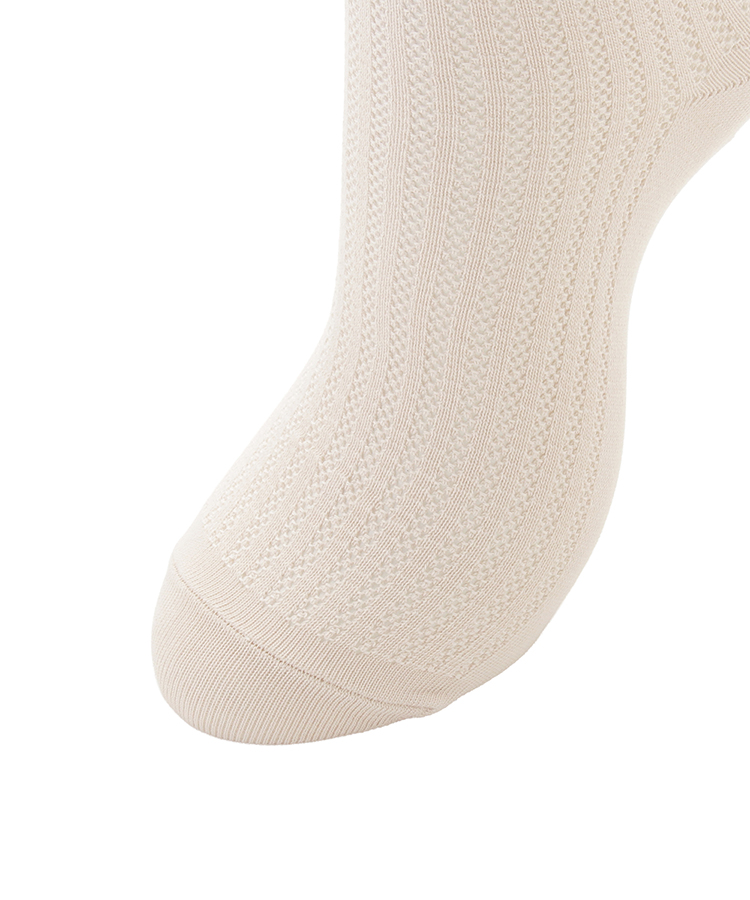 かぎ編みのような透かしストライプ模様が軽やかさとトレンド感を演出するハイソックスです。