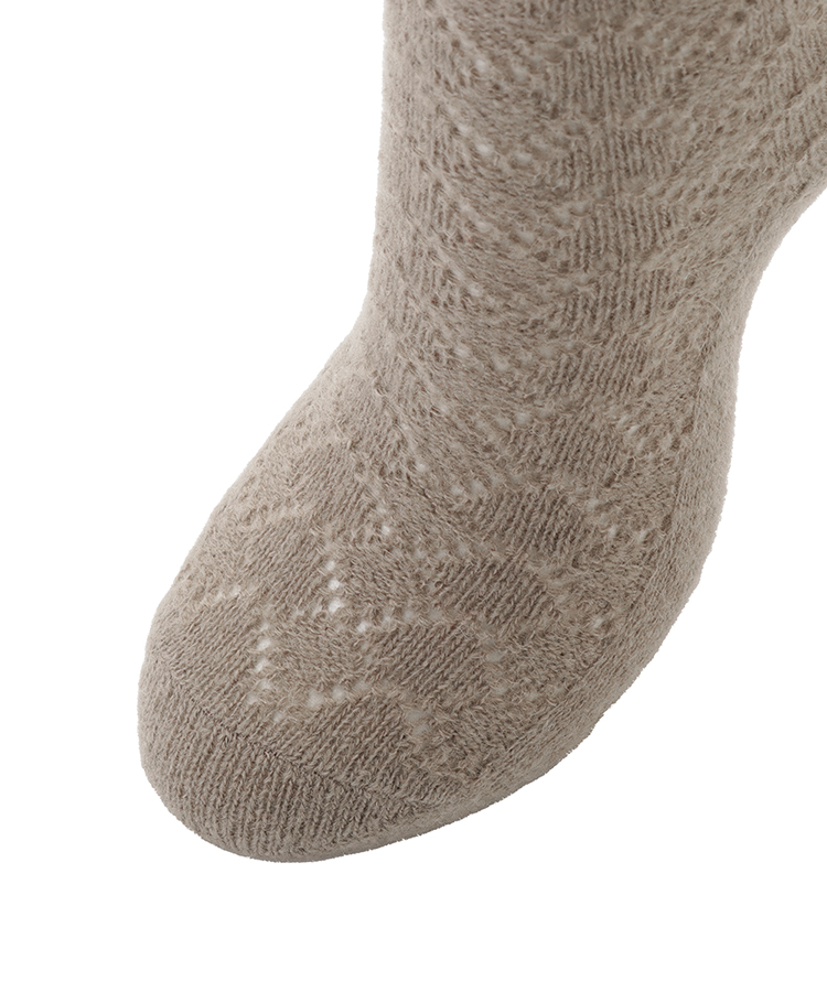 毛足のあるふんわりとした糸で編んだ透かし模様のソックスです。