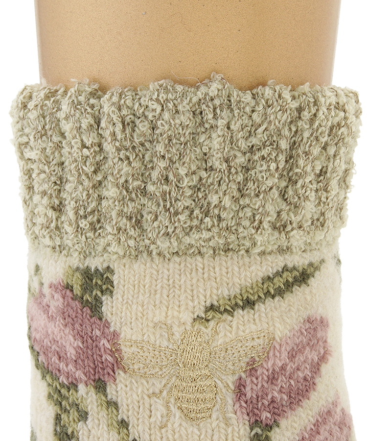 チューリップの花畑に蜂がとまるシーンを表現したルームソックス。