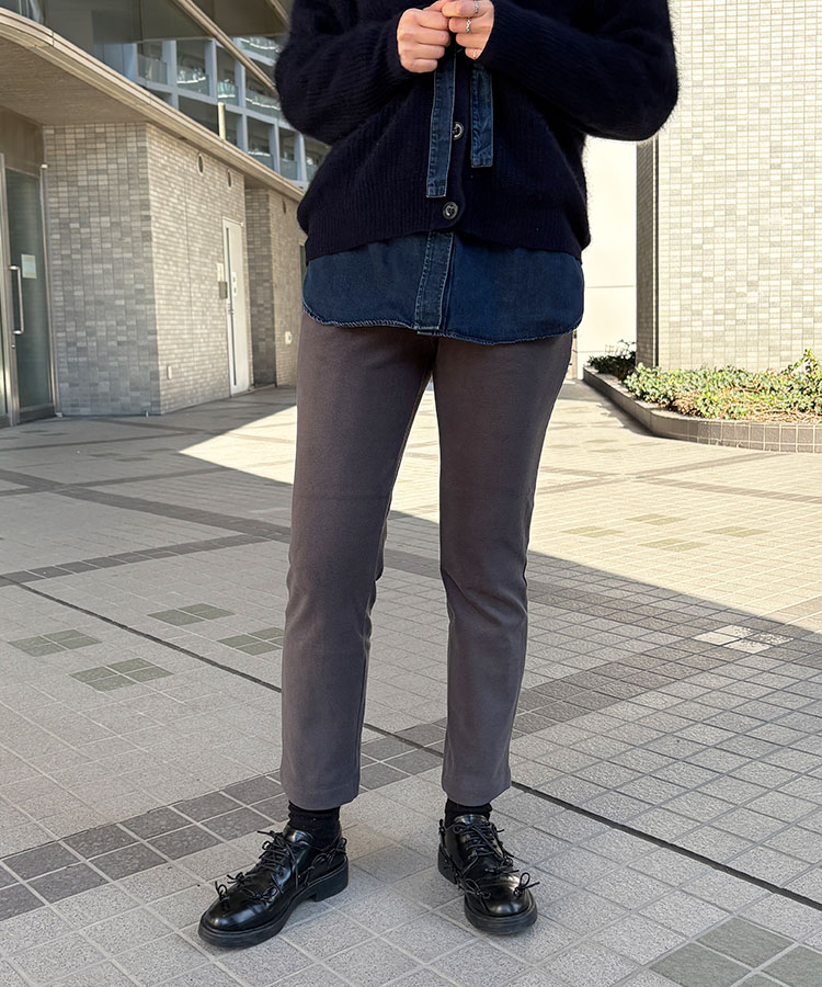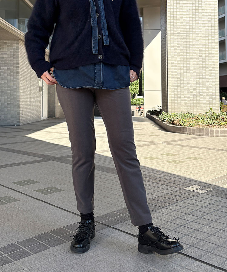 まるでおもちのように伸びるストレッチの良さ、むちっとした膨らみ感のある生地であたたかくて軽い履き心地が一度履いたらやみつきに。