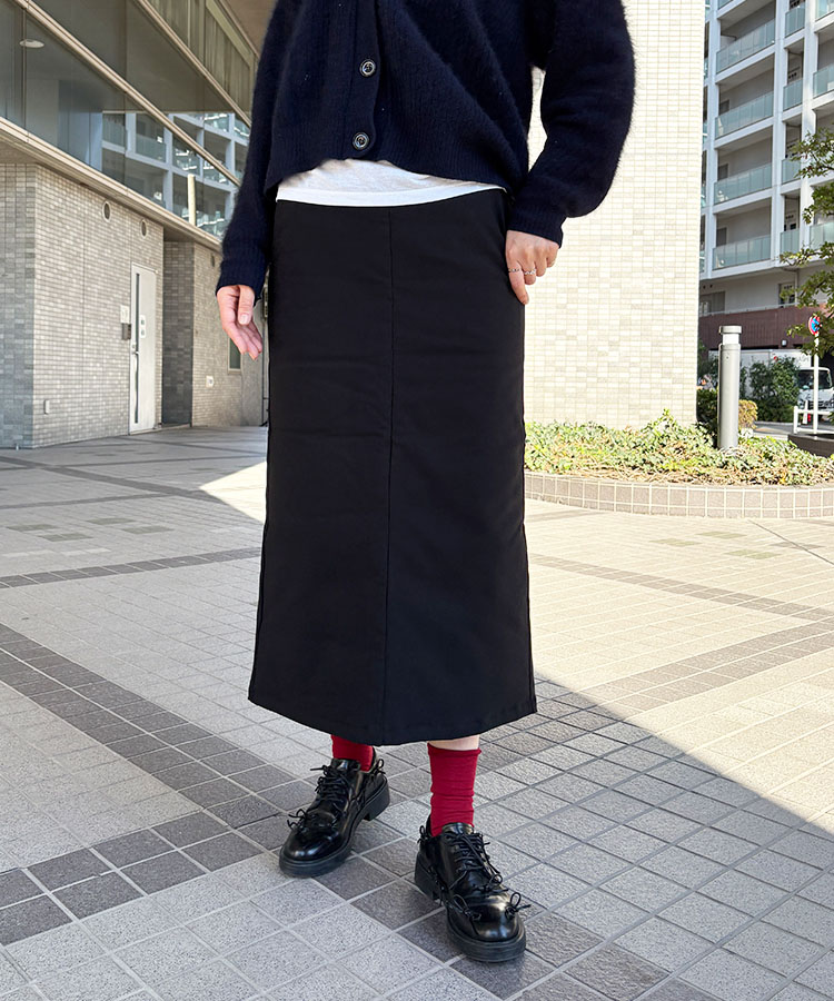 くるぶしが見えるくらいのロング丈なので、レッグウェアとのコーディネートも楽しめます。