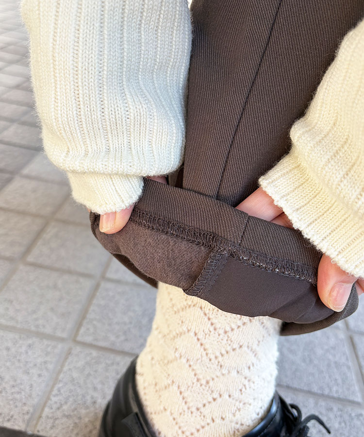 秋口からご使用頂けるよう、ダウンパックは薄く仕上げ前身頃に内蔵しノンステッチに仕上げているので、ダウンパンツには見えないくらいスッキリとお履き頂けます。