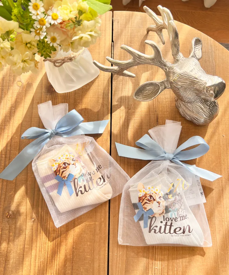 そのままお渡しいただけるラッピングいらずのかわいいオーガンジー巾着に入ったソックスギフトです。