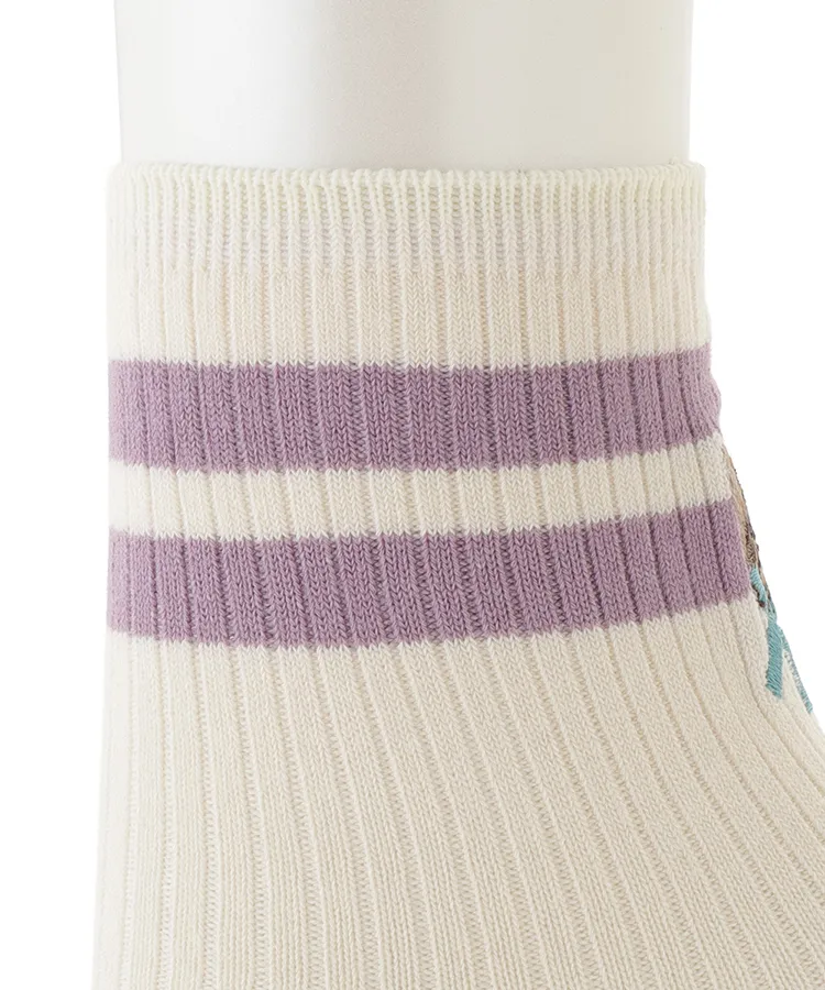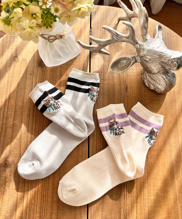 お家でもお外でもお履きいただけるベーシックなボーダーリブソックスにネコの刺繍を施しました。