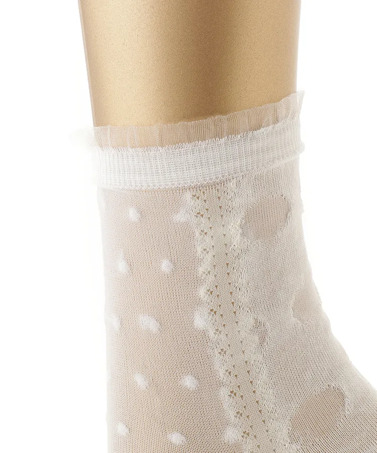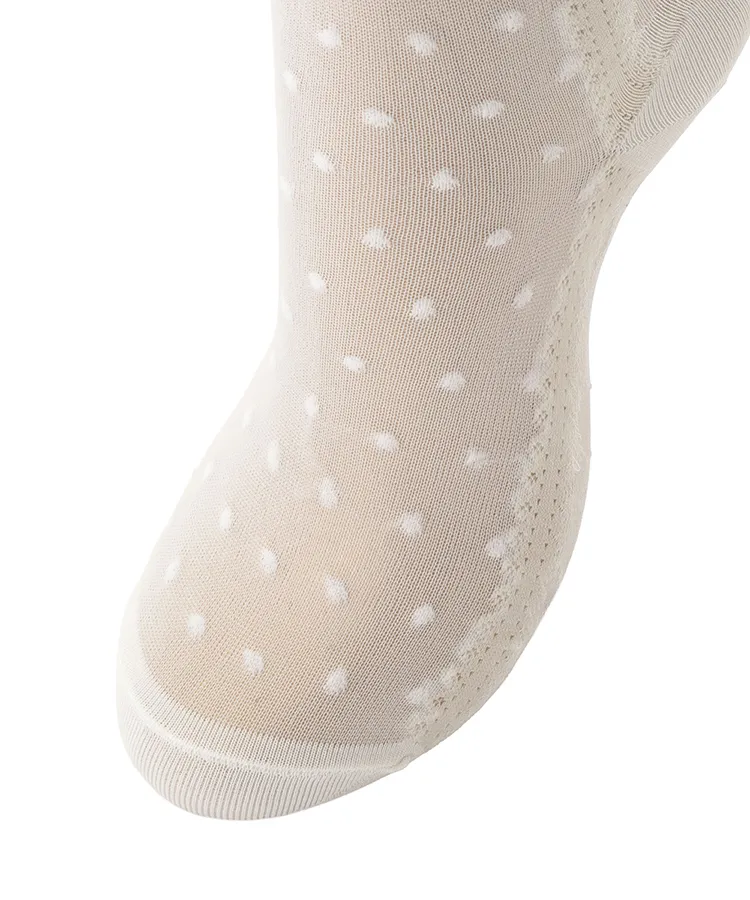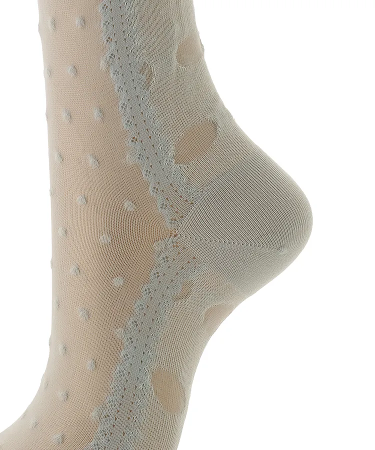 前はピンドット、後はポルカドットの大きさを変えた2つのドットをあしらったデザインソックス。