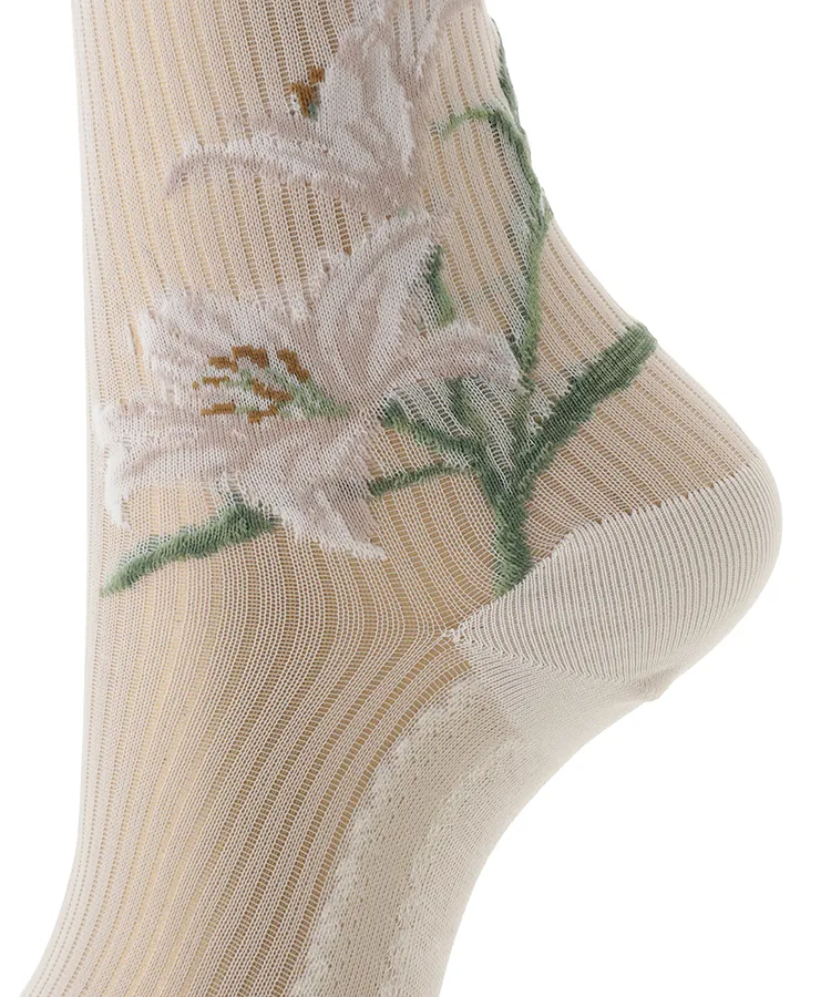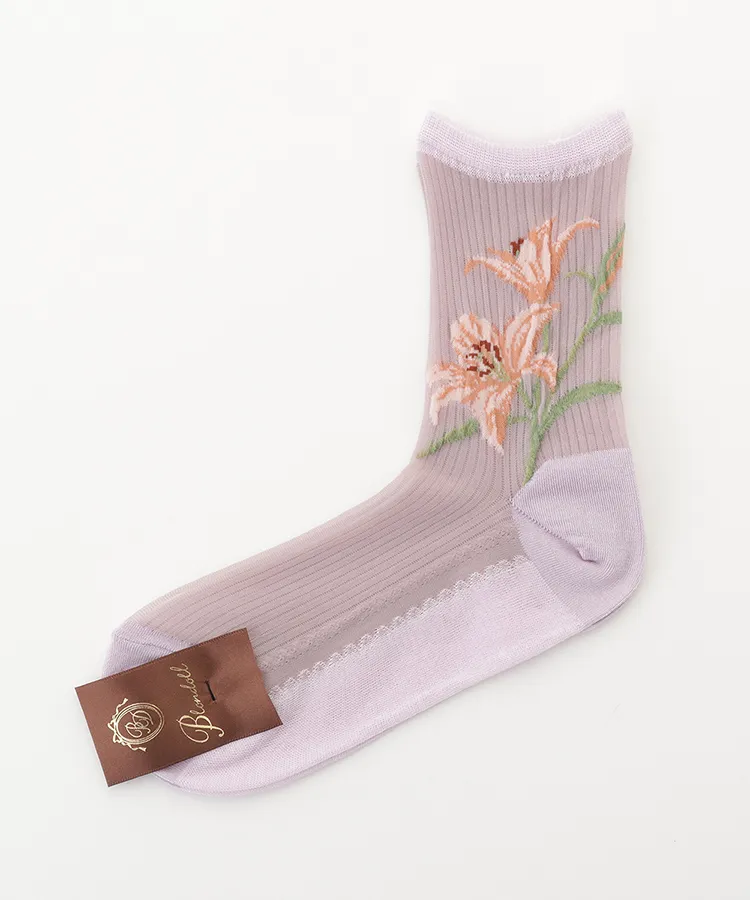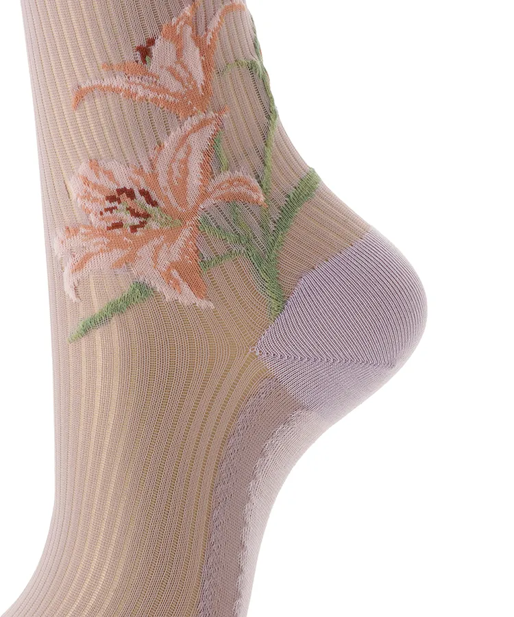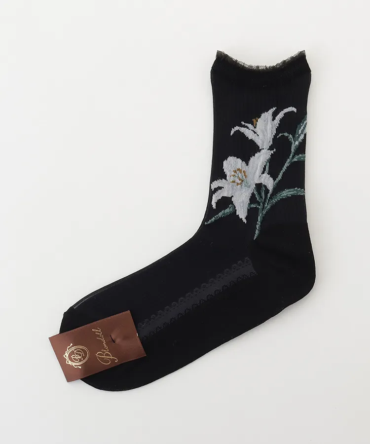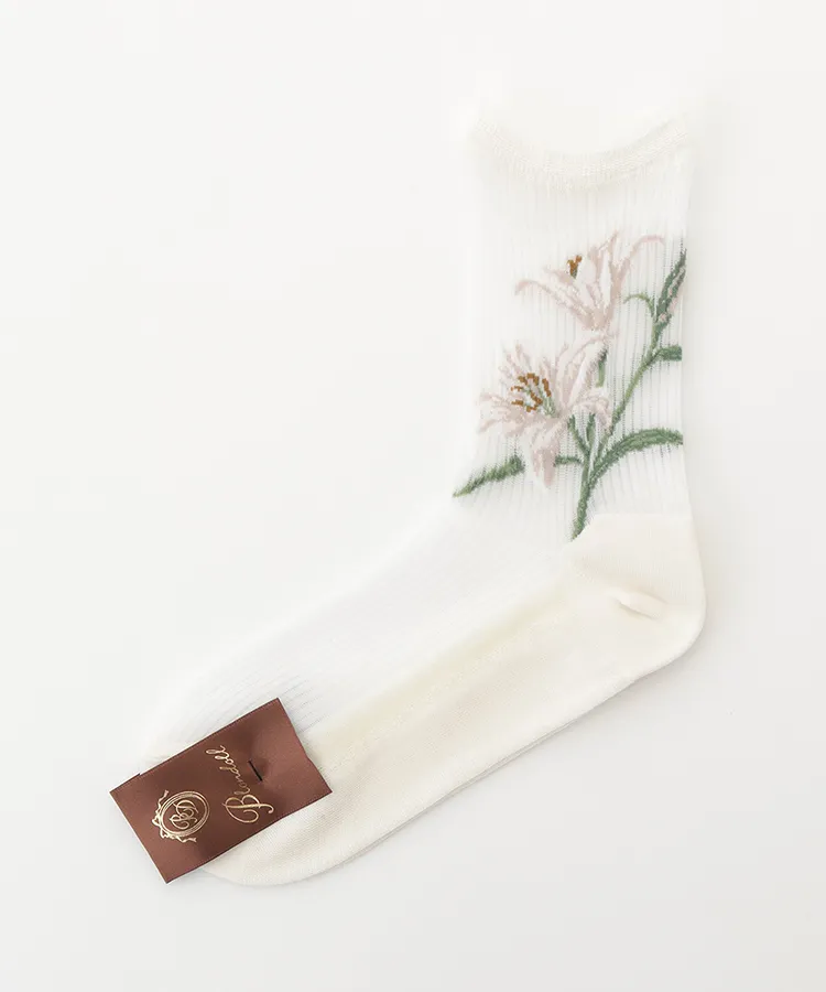 両サイドに大胆な百合の花を編み立てたデザインソックス。