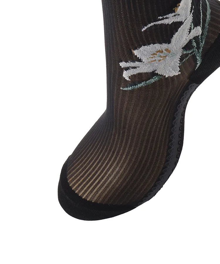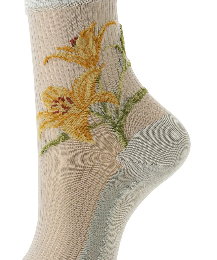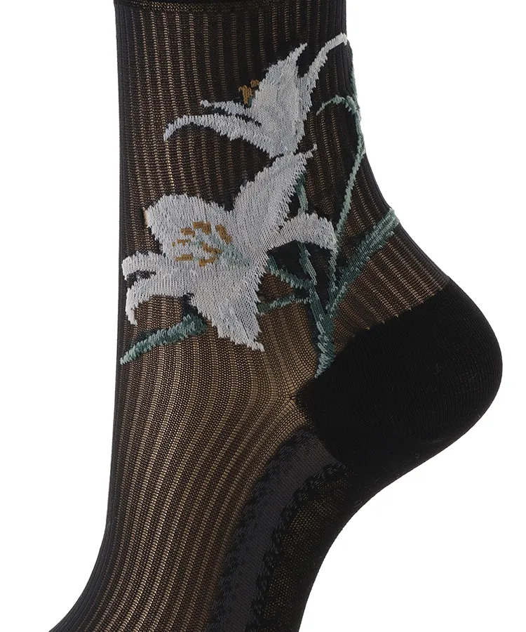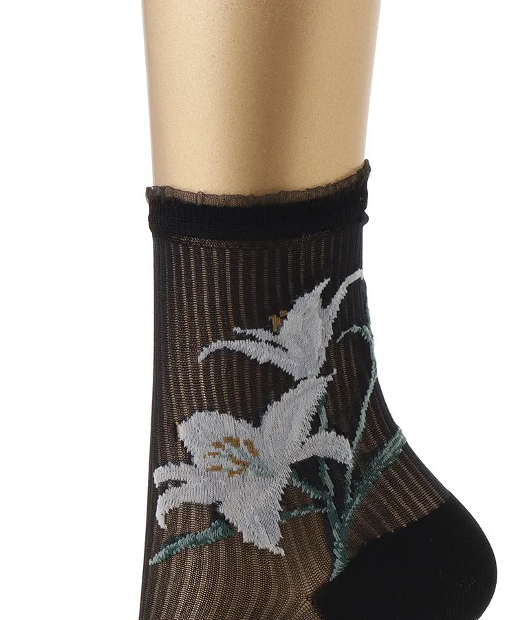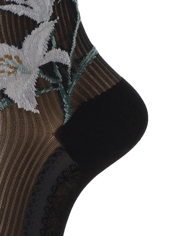 両サイドに大胆な百合の花を編み立てたデザインソックス。