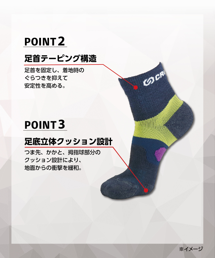 つま先・踵・拇指球部分のクッション設計によって地面からの衝撃を緩和します。